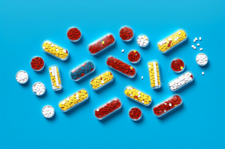 Global Pharmaceutical Industry and Medicinal Products - Colored Pills or Capsules Scattered on Blue Background