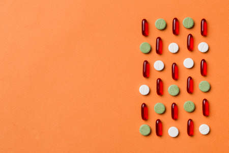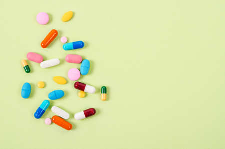 assorted pills and tablets top border over colored background. Many different pills and space for text on colorful background, top view.