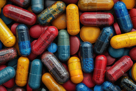 A diverse collection of colorful pills and capsules closely packed together. Generate AI