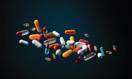 A dynamic array of colorful capsules and pills floating against a teal backdrop. Generate AI