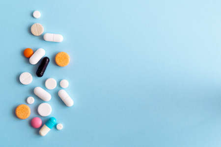 Colorful tablets with capsules and pills on blue background. Copy space