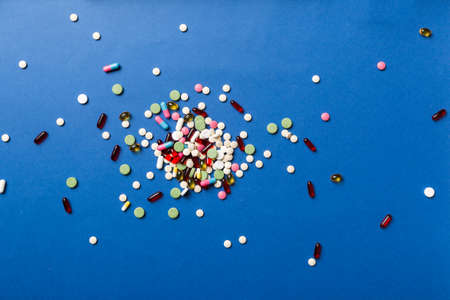 A lot of multicolored pills and capsules on a blue background as a concept of addiction from medicine. Vitamins to keep immunity on a high level.