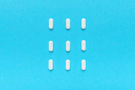 Flat lay pills on cyan blue background. horizontal