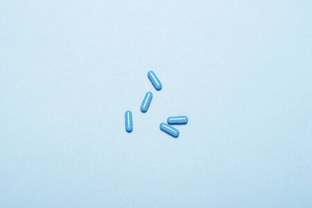 Blue capsules with medicine on a blue background. Concept of medication, illness, drug, sick. Flat lay, top view.