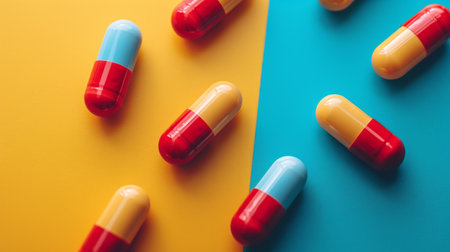 minimalist vivid advertisment background with medical pills and copy space.