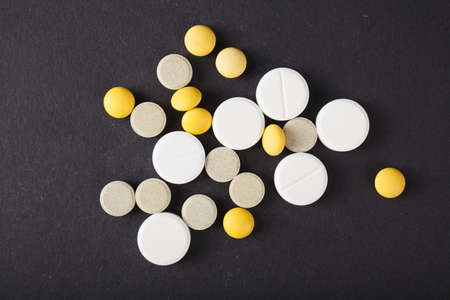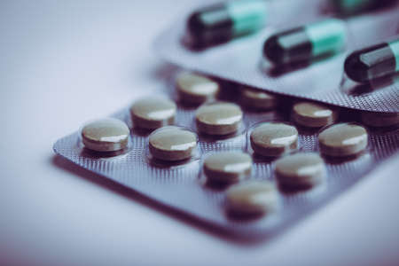Different tablets, pills, medications drugs macro photo. Medicine, sickness
