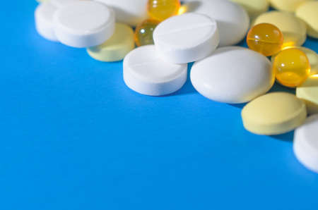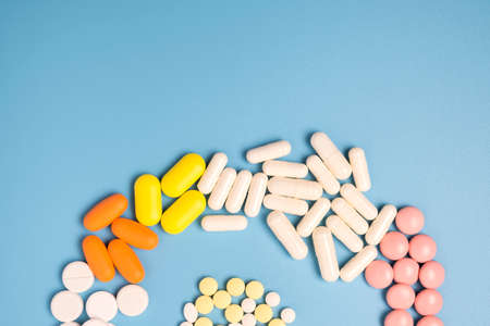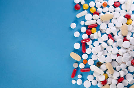 A lot of multicolored pills and capsules on a blue background as a concept of addiction from medicine. Vitamins to keep immunity on a high level.