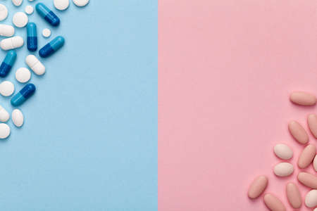 Medical pills for man and woman on blue and pink background. Copy space. Top view