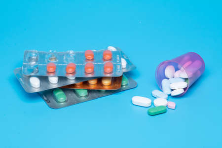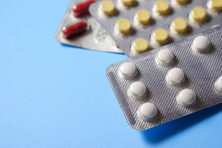 Different medicines: tablets, pills in blister pack, medications drugs on blue background. Close-up photo, copy space. High quality photo