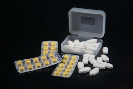 Capsules and tablets of white and yellow color, a jar. Black background. Health concept