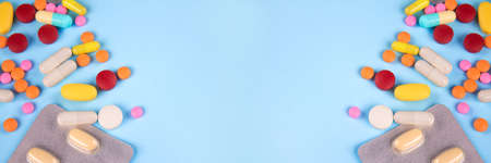 Banner - assorted multicolored medicine pills, capsules and tablets in blisters on blue background with copy space. Immune system vitamins and supplemets. Dietary bio supplements. Selective focus