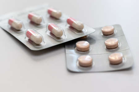 Assorted pharmaceutical medicine pills, tablets and capsules with blurred background over white background. Concept of healthcare and medicine. Copy space.