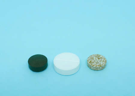 A lot of white, black and grey tablets lie on the blue surface. Background image on medical and pharmaceutical topics