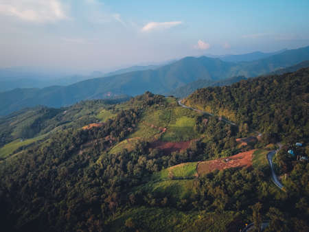 Aerial view of mountain road and green forest at sunset in Thailand