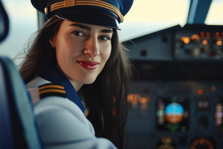 Professional female pilot in captain uniform operating aircraft controls in modern airplane cockpit. for aviation industry, career inspiration, women empowerment, and transportation concepts.