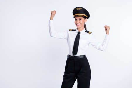 Portrait of attractive cheerful pilot girl demonstrating strong biceps success isolated over white color background