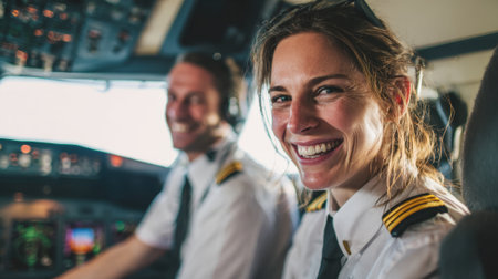 illustration of the cockpit of a plane with a happy woman pilot with Generative AI