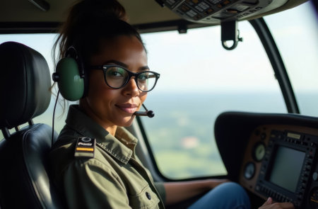 Portrait of female pilot wearing headset sitting in helicopter cabin and looking at camera