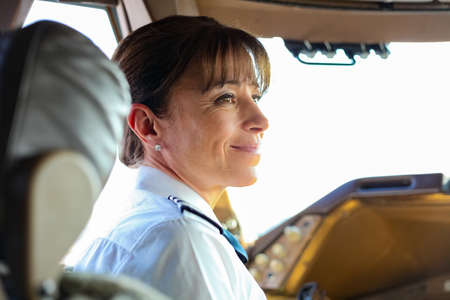 Professional female pilot is navigating an airplane