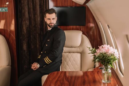 Beaming man in uniform sitting on the chair in cockpit of passenger airplane