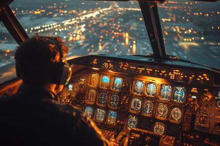 The cockpit is illuminated by the glow of various instruments as the pilot skillfully maneuvers a commercial aircraft for a nighttime landing. The city skyline sparkles with lights beneath, creating a stunning backdrop.