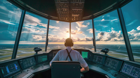 Air traffic controller gazes with screens at sunset-lit runway through tower windows.