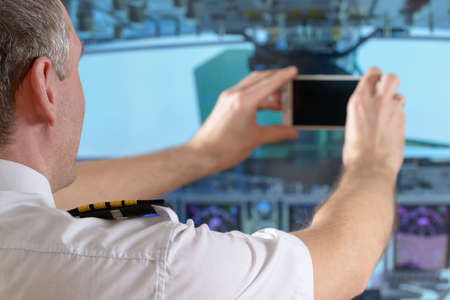 Airline pilot wearing uniform with epauletes taking pictures with smart phone in airplane cockpit