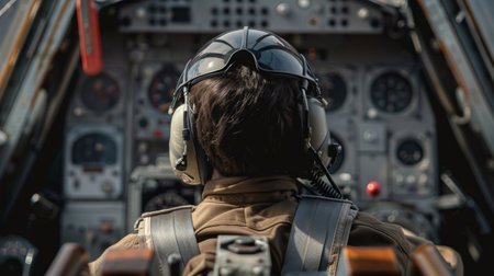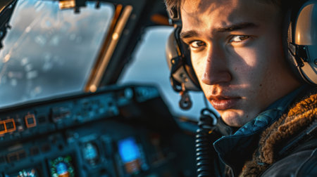 Young pilot in cockpit with headset, intense expression
