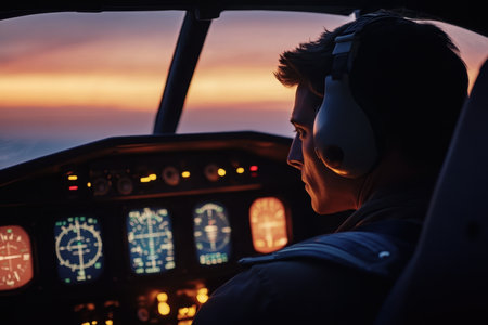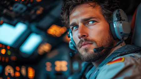 Close-up portrait of male pilot deeply engaged in communication with air traffic control in softly lit cockpit