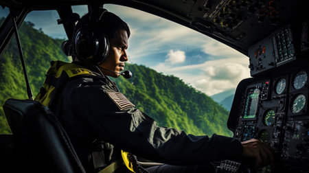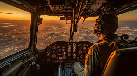 Flying High, A Military Pilot in the Cockpit of a Helicopter with a City View and Instrumentation, Generative AI