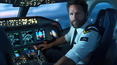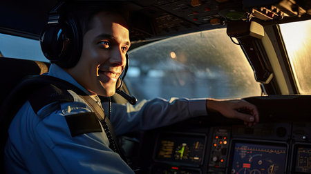 A pilot confidently sitting in the cockpit of a commercial plane, preparing for takeoff
