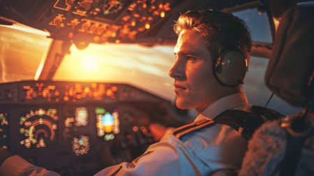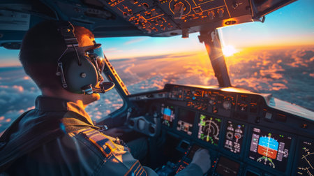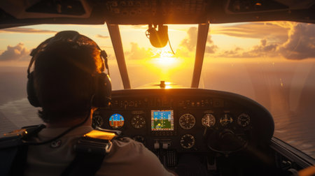 A man in the cockpit of a plane, illuminated by the warm hues of a sunset. He is focused on handling the controls, with the sky painted in shades of orange and pink in the background.