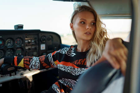 Young fashionable woman pilot ready to fly, start training, in small airplane. Learning process.