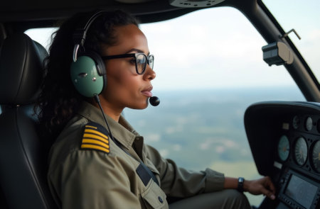 Beautiful african american female pilot sitting in cockpit of helicopter