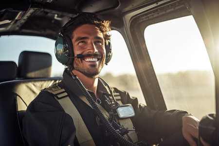 Aircraft commander in military gear, symbolizing leadership and expertise, stands beside his helicopter, radiating professionalism