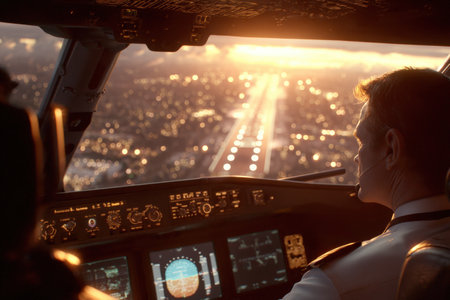 Two pilots focus on their instruments as they approach landing at a major airport. The cockpit displays are lit up, providing crucial flight data in the dark.