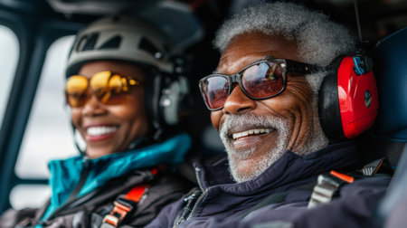 A joyful elderly couple prepares for a thrilling parachute jump from a helicopter. They display love and excitement, embracing new adventures together in their retirement.