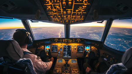 Pilot in airplane cabin gets ready for landing. Beautiful sunset on horizon