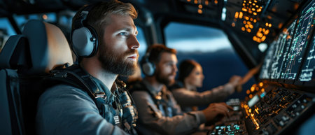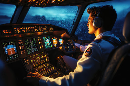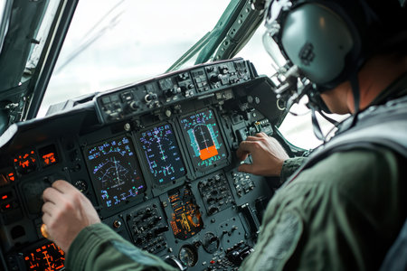 A pilot focused on high-tech cockpit controls, showcasing advanced aviation instruments and technology in a modern flight environment. Perfect for aviation themes.