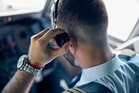 Male airplane captain speaking to ground control through microphone