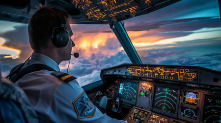 Airline pilot in cockpit flying aircraft through dramatic cloudscape viewed from flight deck with illuminated instrument panel during atmospheric flight conditions.