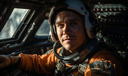 A close-up shot of a pilot in a cockpit, wearing a helmet and looking out the window.