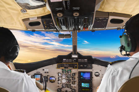 Pilots in the plane cockpit and sunset - transportation background