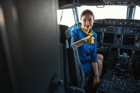 Beaming man in uniform sitting on the chair in cockpit of passenger airplane