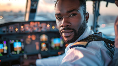 African American male pilot in an airplane cockpit. Concept of aviation, profession, pilot training, cockpit operations.