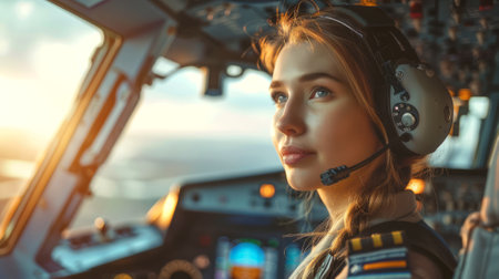 Caucasian female pilot in a cockpit. Concept of woman pilot, aviation, professional female, airplane operation.