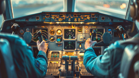 Inside cockpit of commercial airplane while fly approaching the runway. Outside window can see beautiful light from airport and inside cockpit can see pilots flying airplane. Modern aviation concept.