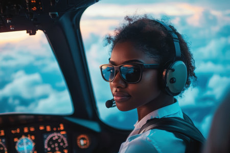 Experienced pilots navigate through clouds at sunset during a peaceful sky journey Generative AI