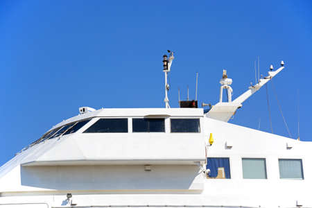 Ferry boat white cabin with big windows. Wing of running bridge of cruise liner. white cruise ship on a blue sky with navigation system. Captain's cabin.