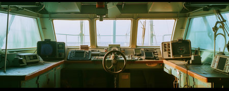 Generative AI Detailed view of the ship's bridge, navigation equipment, expansive ocean, realistic lighting and shadows